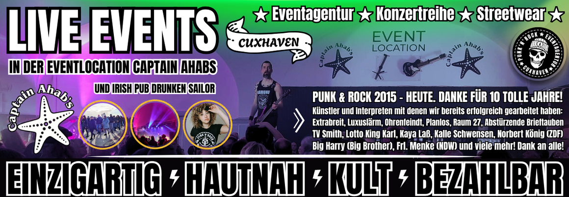 Punk & Rock Veranstaltungen bieten eine perfekte Mischung aus etablierten Künstlern, die die Bühne rocken und aufstrebenden Talenten, die mit ihrer Energie und Kreativität das Publikum begeistern. Besonders die Kohltour ist ein einzigartiges Highlight, bei dem die Teilnehmer in ausgelassener Stimmung entlang der Küstenlinie ziehen. Die Organisatoren legen großen Wert darauf, jedem Event eine persönliche Note zu verleihen. Egal, ob man Musikfan oder einfach nur auf der Suche nach einer guten Zeit ist, "Punk & Rock Cuxhaven" verspricht unvergessliche Erlebnisse und eine ganz außergewöhnliche Partyatmosphäre.