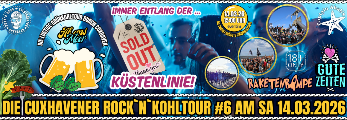 Wenn es so richtig kalt und ungemütlich ist, wird in Norddeutschland traditionell zum Grünkohlessen aufgerufen. Diesen winterlichen Brauch wollen wir weiterhin pflegen, das aber in einer ganz neuen Form. Bei uns gibt es natürlich auch alles, was das norddeutsche Herz höher schlagen lässt: Grünkohl, Kasseler und Kochwurst mit Kartoffeln - damit aber noch lange nicht genug! Über 100 Personen laufen gemeinsam immer entlang der Küste bis zum "Captain Ahabs" und da gibt es noch jede Menge Live-Musik!